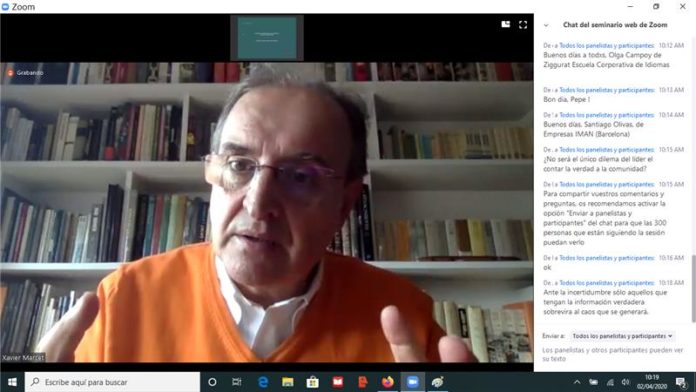 Más de 300 personas participaron en la sesión en directo donde Marcet describió claramente el perfil necesario de liderazgo, en empresas y organizaciones, para superar la crisis económica producida por la pandemia del COVID-19. ‘Hay empresas que reaccionan, se adaptan, no se quedan paradas y eso es lo que debe fomentar un buen líder’.