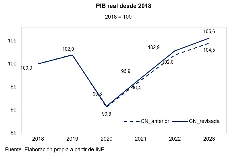 • Con estas revisiones, el crecimiento acumulado del PIB desde 2019 y hasta 2023 fue 1,1 puntos superior al estimado hasta la fecha