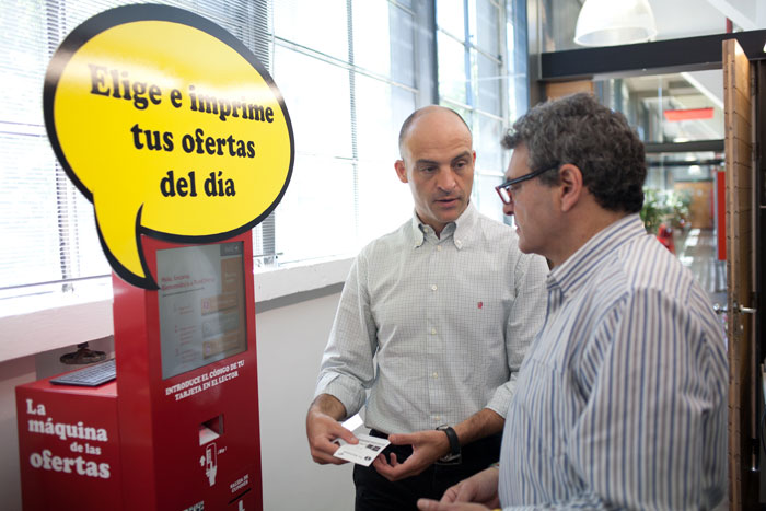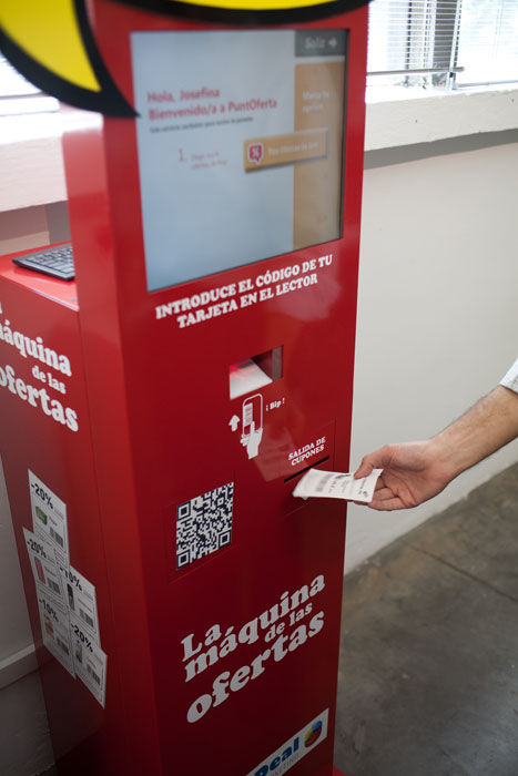 Le hago una demostración. Tengo aquí una tarjeta, la de la señora Encarna, por poner un ejemplo, que compra patatas fritas, cerveza, jabón detergente para vajillas y otros productos. Pues bien, la máquina, después de saludarla, le ofrece unas ofertas de esos y otros productos. Solo debe aceptar aquellos que le interesen y saldrán los vales descuentos.