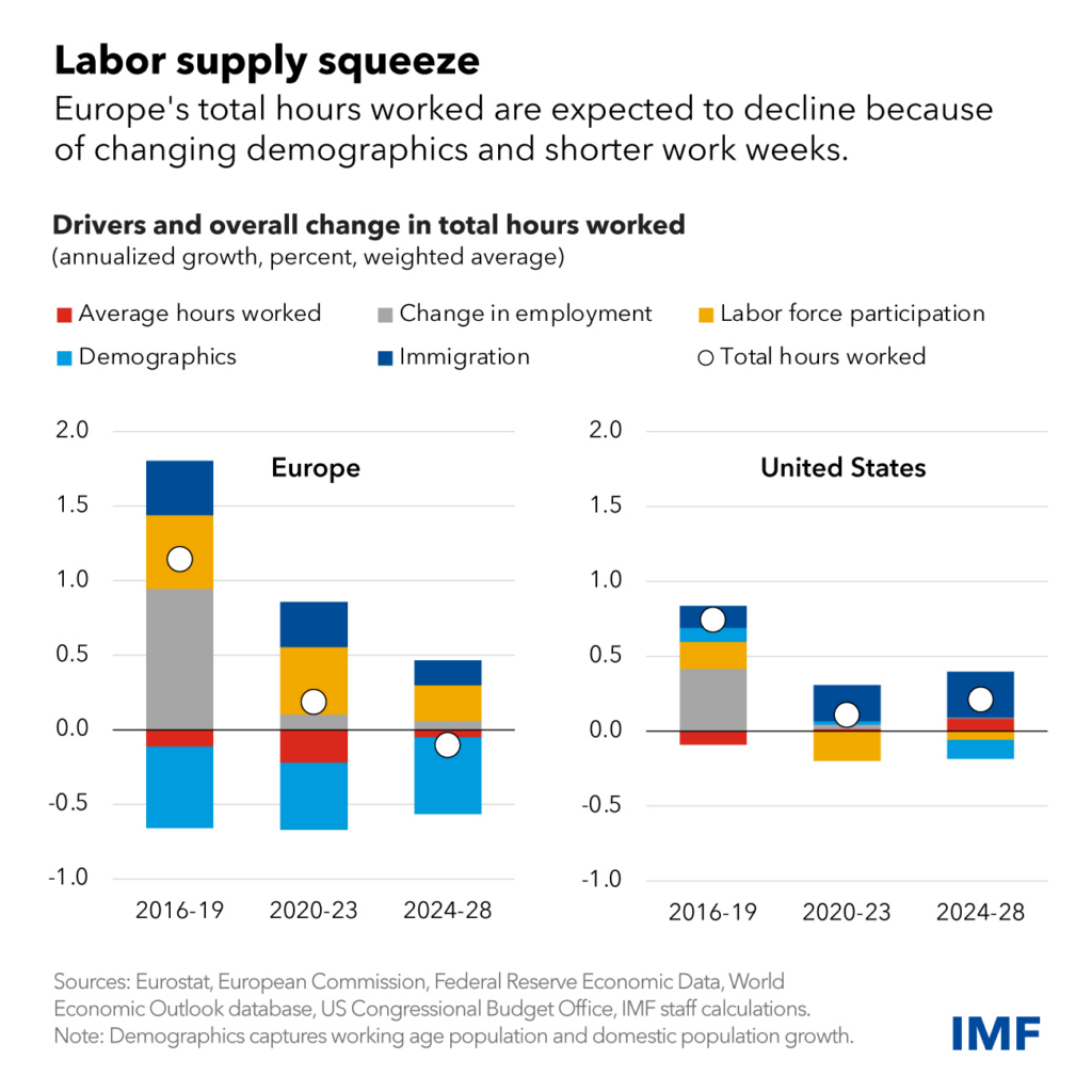 Durante la última década, la participación de la fuerza laboral europea creció relativamente rápido. Incluso si esta tendencia continúa, la oferta laboral podría disminuir un 0,1 por ciento anual durante los próximos cinco años a medida que la población envejece, el crecimiento demográfico se desacelera y continúa el acortamiento de las semanas laborales. Por el contrario, se espera que la oferta laboral estadounidense crezca un 0,2 por ciento a medida que la inmigración y las jornadas laborales más largas compensen con creces el deterioro de la demografía.